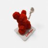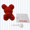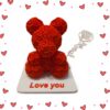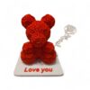 Minimalistická dekorácia s výrazným detailom. Medvedík s jemnou textúrou stojí na stabilnom podstavci s nápisom „Love you“ a drží jednoduchý symbol v tvare ruže.