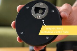 Unikátnym prvkom je reces v spodnej časti s magnetom, ktorý okamžite zachytí vrchnák po otvorení fľaše. Už žiadne hľadanie, žiadne neporiadky – vrchnák zostane prichytený priamo na podložke.