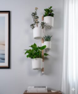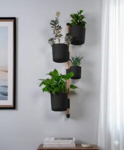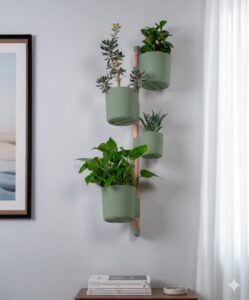 Tento The Wall System je modulárny vertikálny nástenný kvetináč navrhnutý pre moderné interiéry. Systém pozostáva z prírodnej vertikálnej drevenej tyče a minimalistických matných valcových kvetináčov usporiadaných v odstupňovaných výškach.